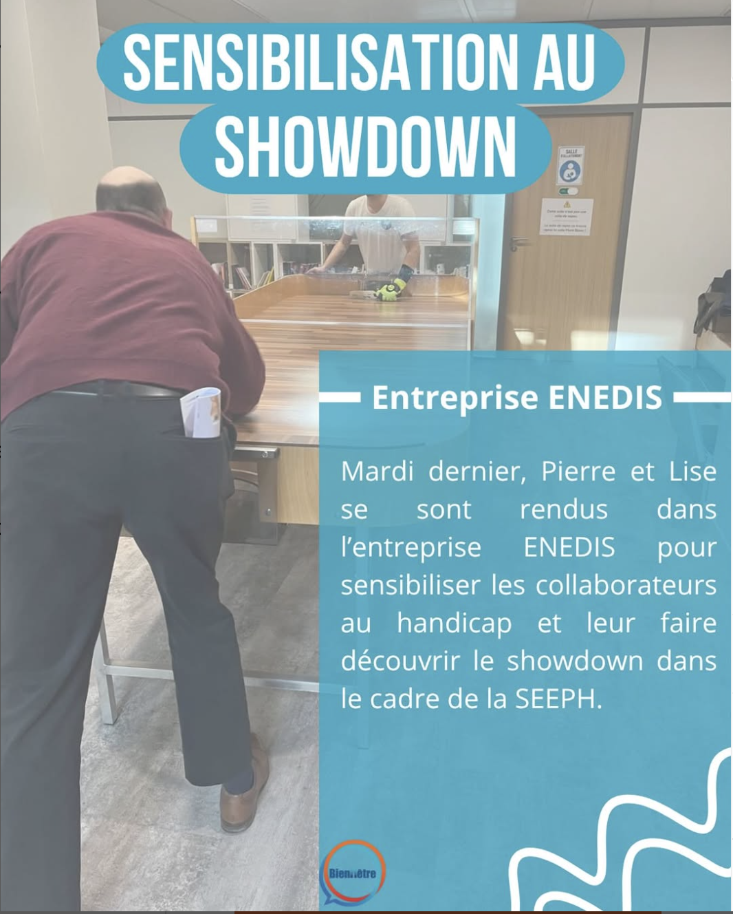 Dans le cadre de la #SEEPH, Pierre et Lise ont animé une séance de découverte du showdown auprès des collaborateurs d’ENEDIS afin de mieux comprendre la pratique et les enjeux du handicap visuel.